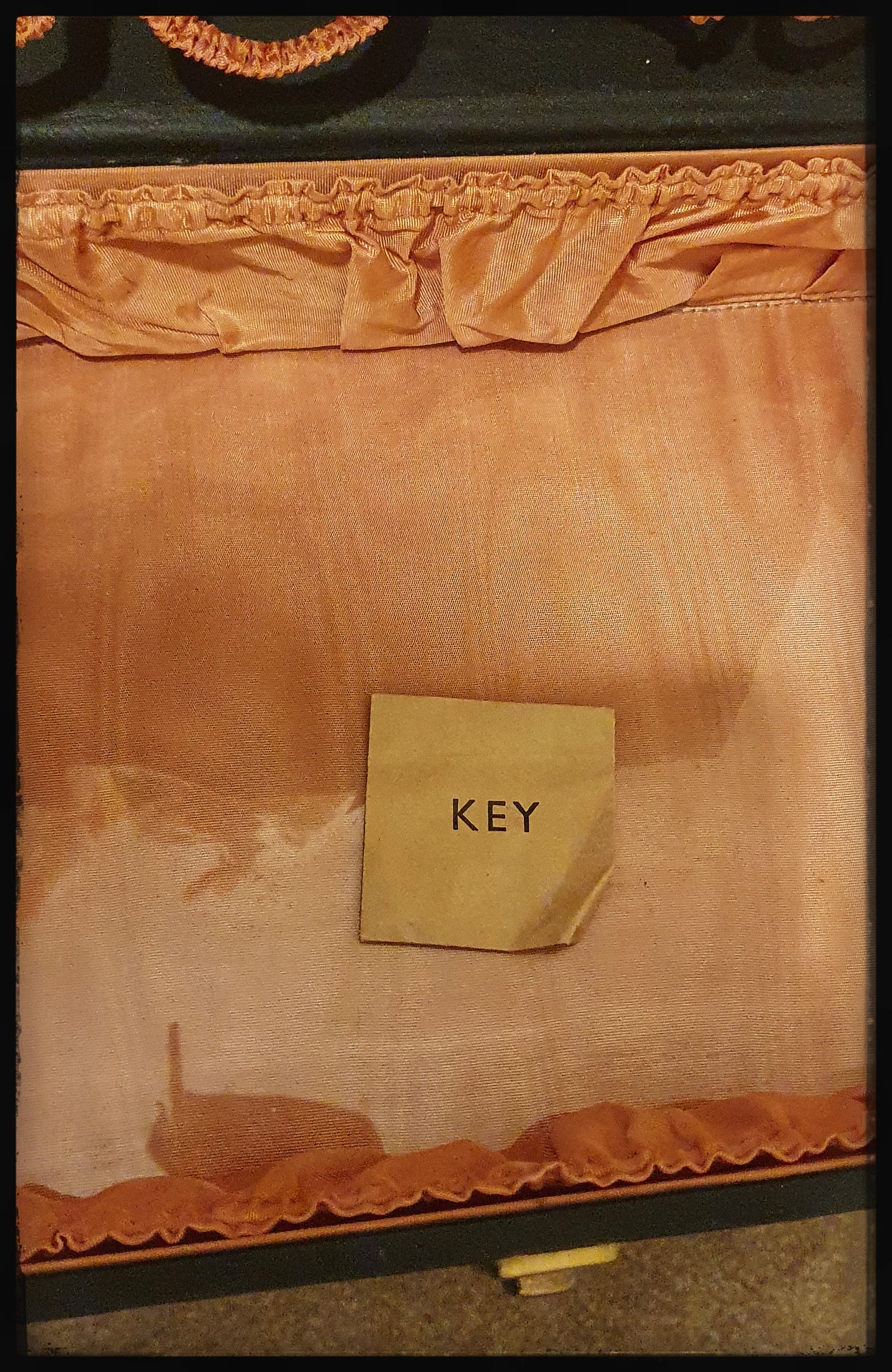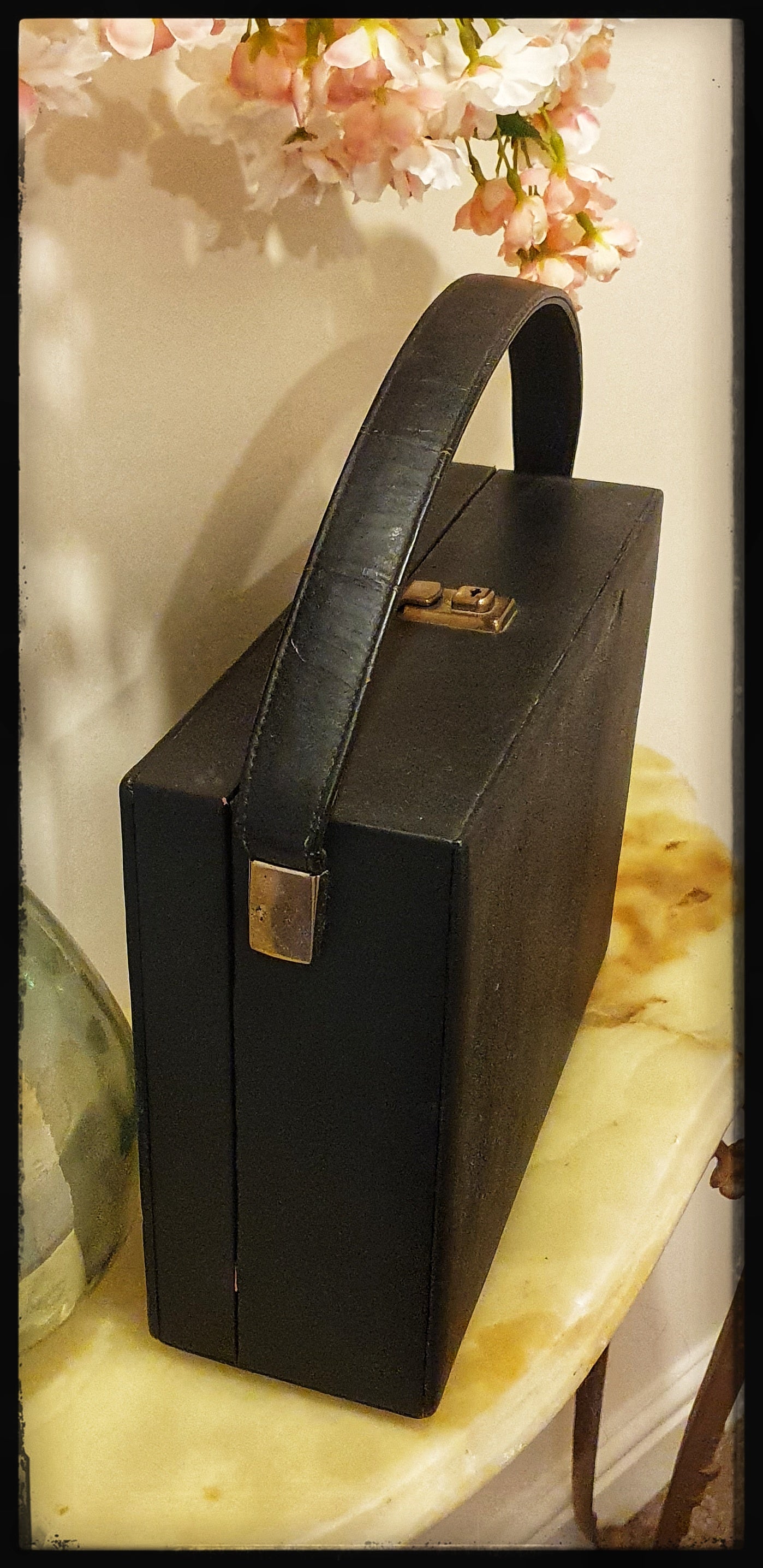 This 1940s-1950s black vanity case features a top handle with a brass locking clasp and an accompanying key in its original paper envelope. With its brass colored and metal fittings on the sides of the case, this item appears to be unused. The case is lined with a watermarked taffeta and has a plastic covering on the base, as well as two elasticated pockets and four elasticated bottle holders on the lid, possibly for holding a mirror. Despite the missing mirror, this case is in excellent condition with only a few minor marks on the outside, expected from its age. It makes for a perfect travel companion and is made from real luxenhide in England. Measurements include a width of 12 inches, depth of 4 inches, and height of 9 inches.