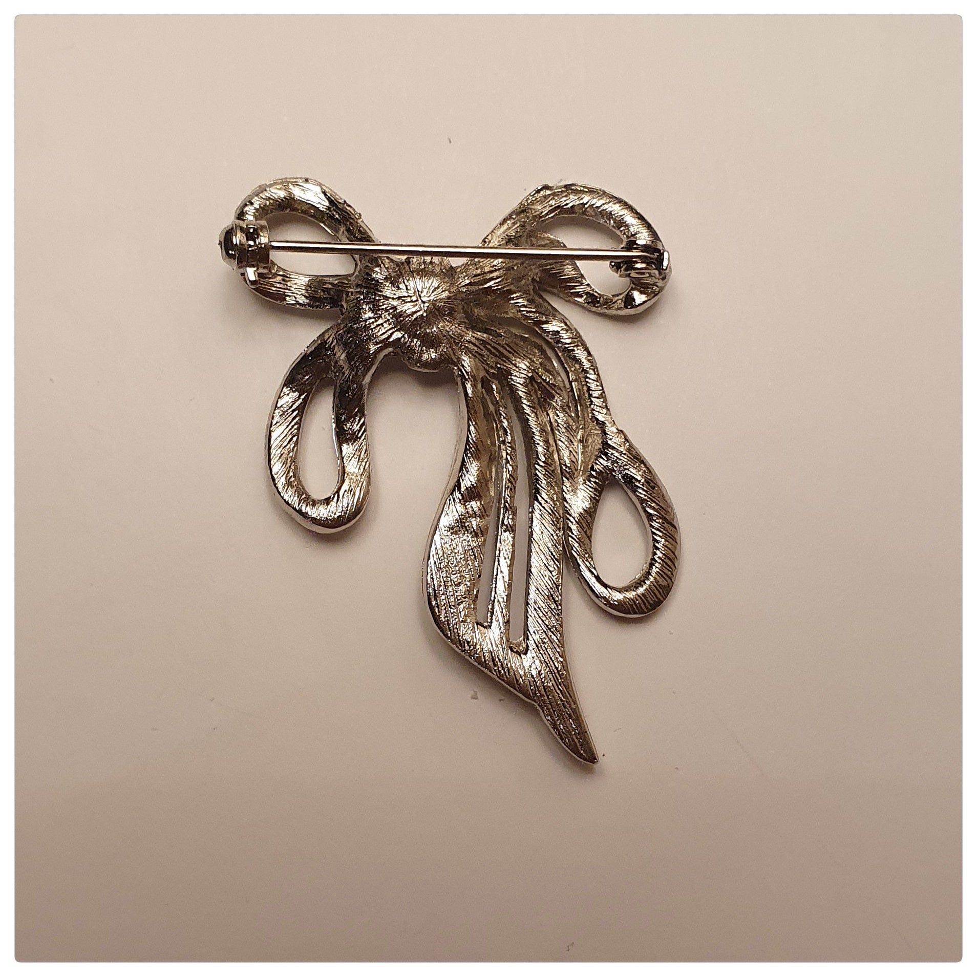 This stylish marcasite bow brooch is a genuine vintage piece, dating back to the 1950s. Made with silver tone metal and secure roll over clasp, it has never been worn and is in pristine condition. The height measures 2 inches and the width measures 1 1/4 inches.