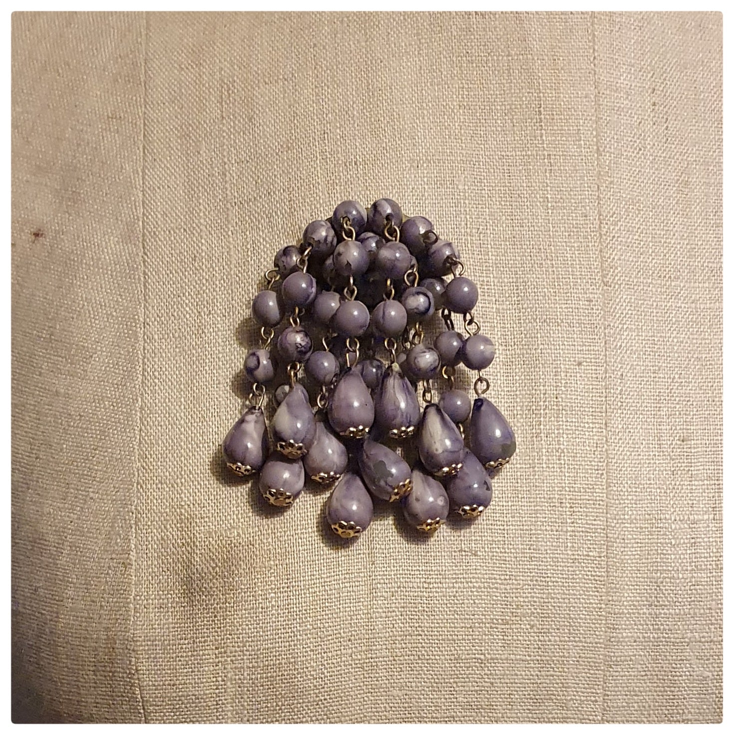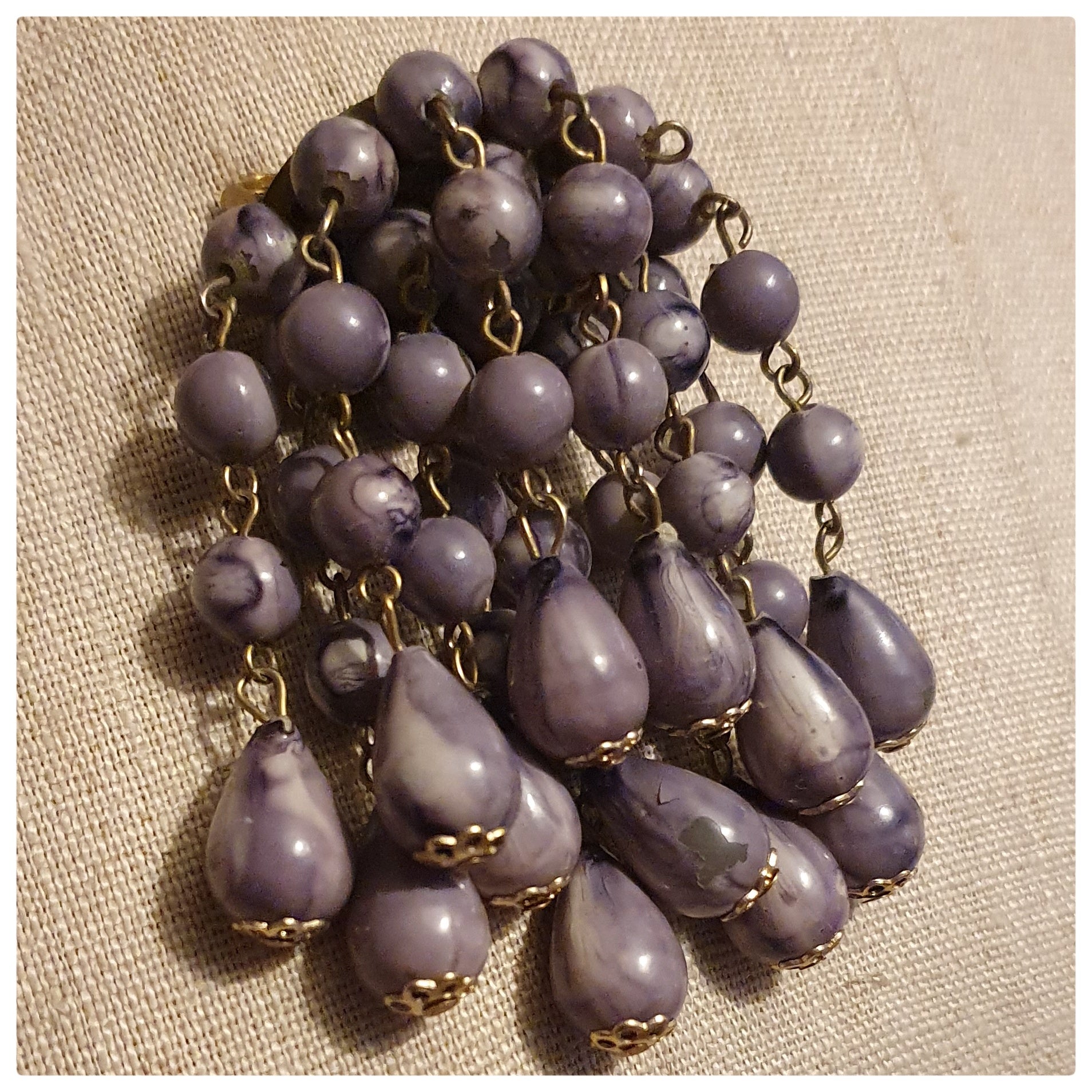 This vintage 1960s brooch features a cascading waterfall design, adorned with stunning teardrop beads in a mesmerizing grey marbled effect. It is crafted with goldtone metal and secured with a c-clasp. Unmarked, it measures approximately 50mm wide and 77mm in length. Due to the unique style of this piece, some beads may have minor paint loss. Expertly crafted with precise measurements, this brooch is a must-have for any collector or fashion enthusiast.