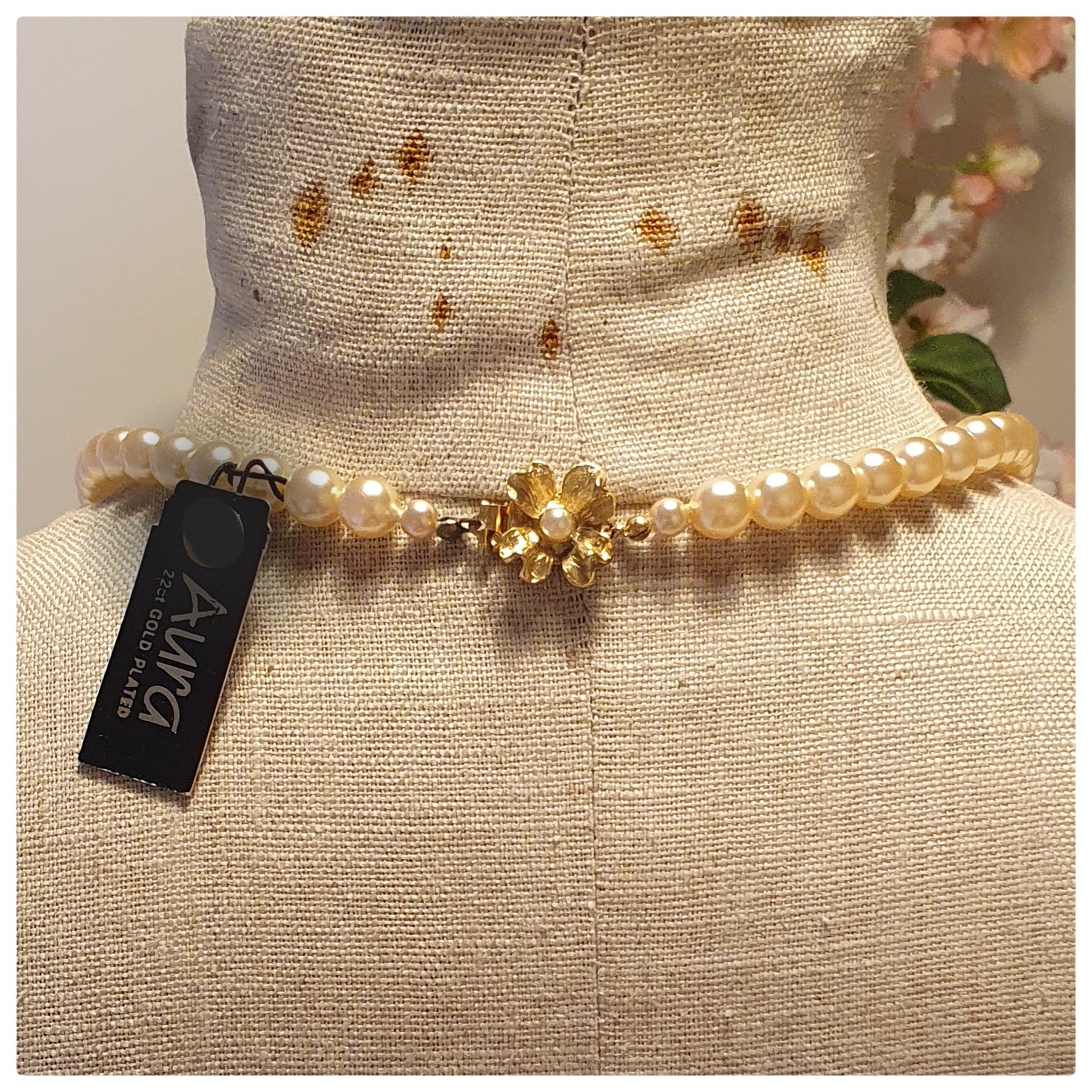 Enhance your ensemble with this unworn, elegant necklace from Aura. The single strand faux pearl design, crafted from glass, exudes sophistication and class. Adorned with a 22ct plated box clasp featuring a delicate flower and a centerpiece faux pearl, this necklace adds a touch of luxury to any wardrobe. Though some tarnishing may be present on the fixings, this necklace still shines with a 12 inch drop from the clasp. Experience the exclusivity of premium fashion with this 1980s statement piece.
