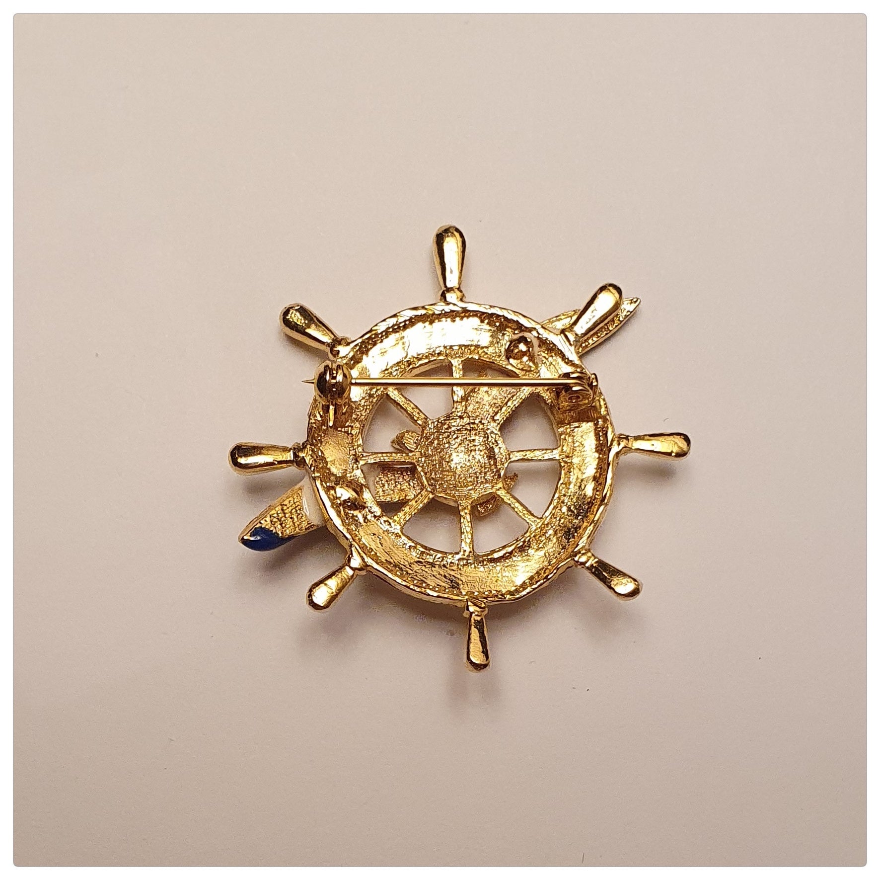 This brooch is a vintage piece that has never been worn. It features a white enamel ship wheel with a blue seagull on a gold tone metal. It has a secure roll over clasp.