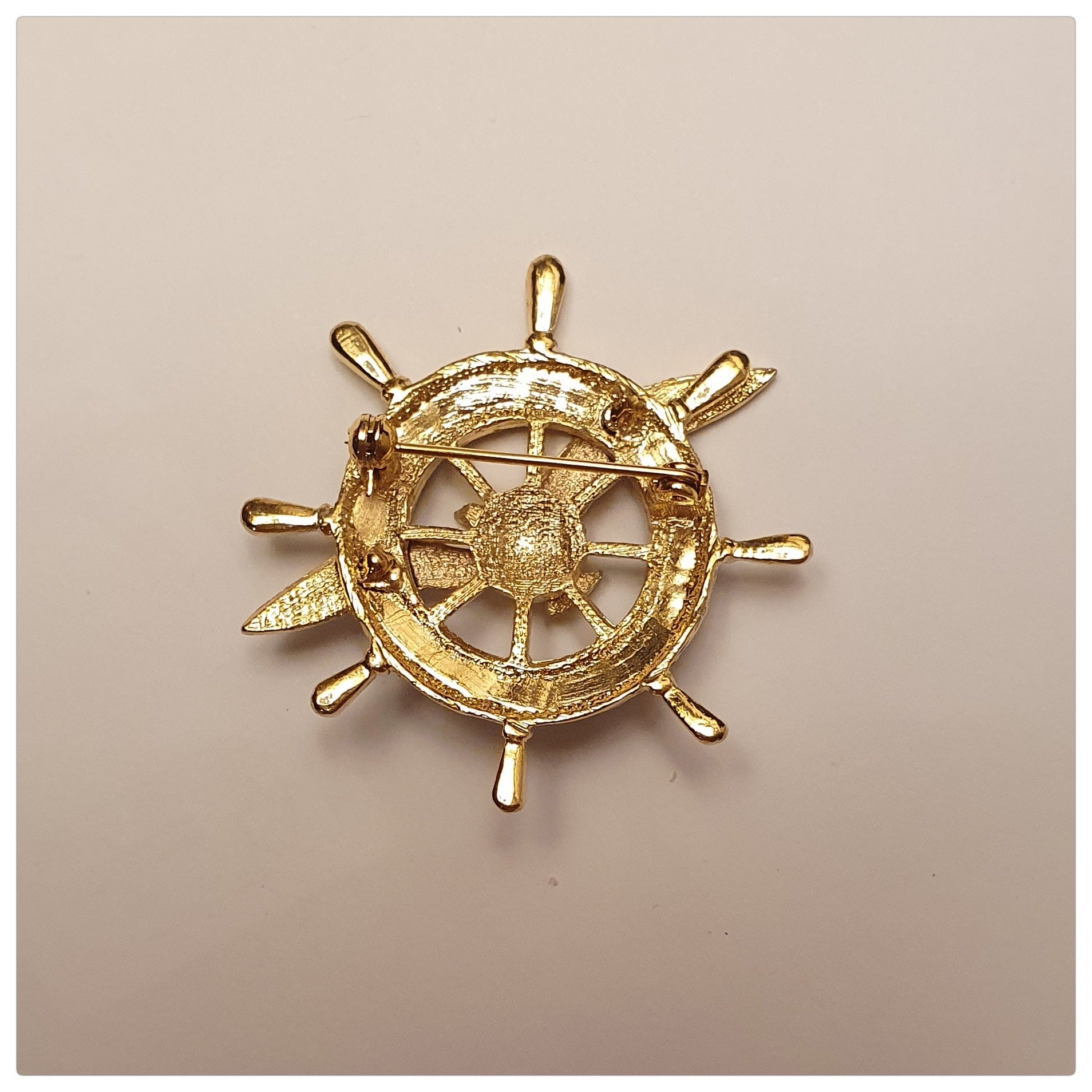 This item is a never-worn enamel brooch from the 1980s, featuring a blue ship's wheel and a white seagull, all on a gold tone metal. It is considered 'new old stock', meaning it is an original vintage item that has never been used. Measurements show the seagull's wingspan at 2 inches.