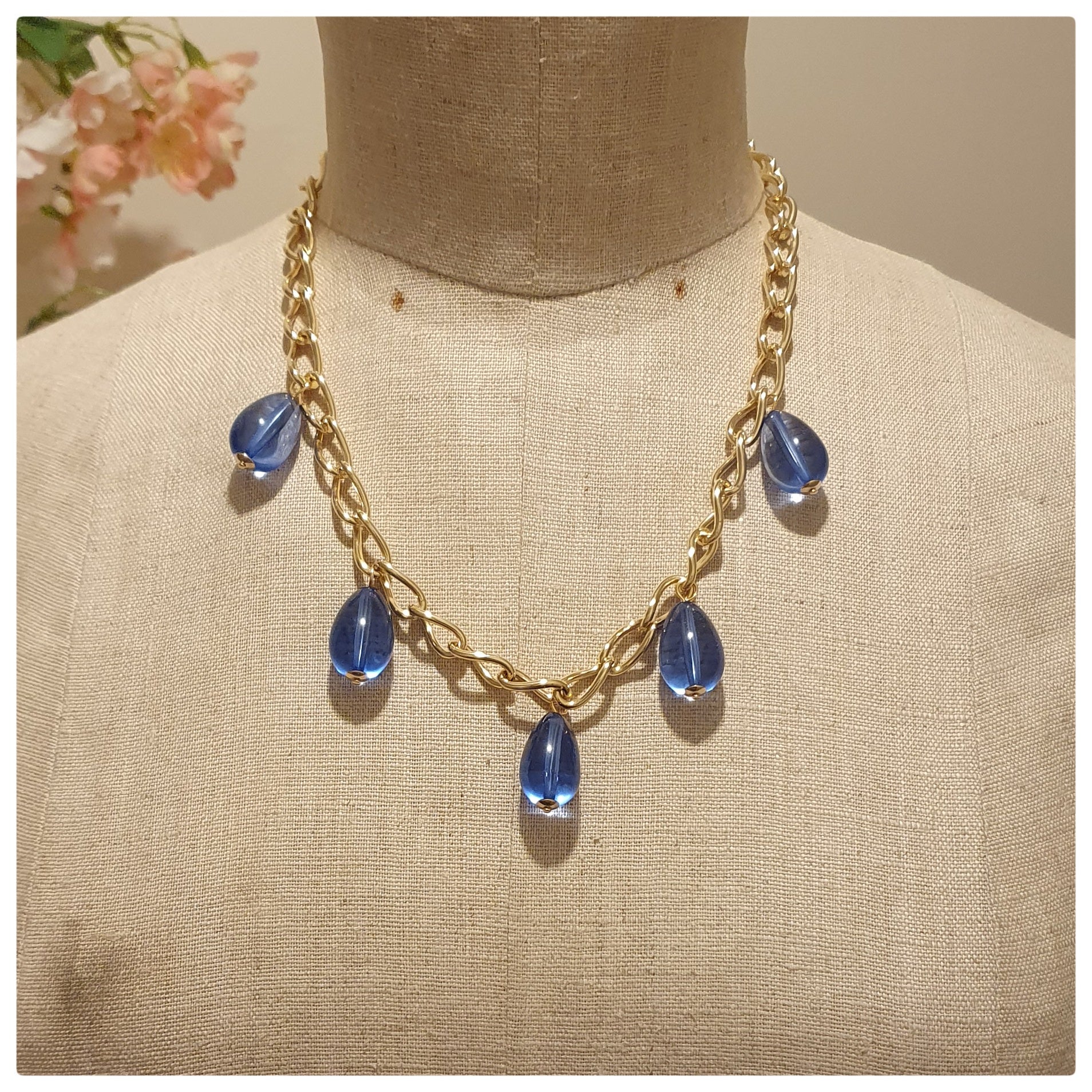 1980s FRANK USHER BLUE DROP AND GOLDTONE NECKLACE NOS
