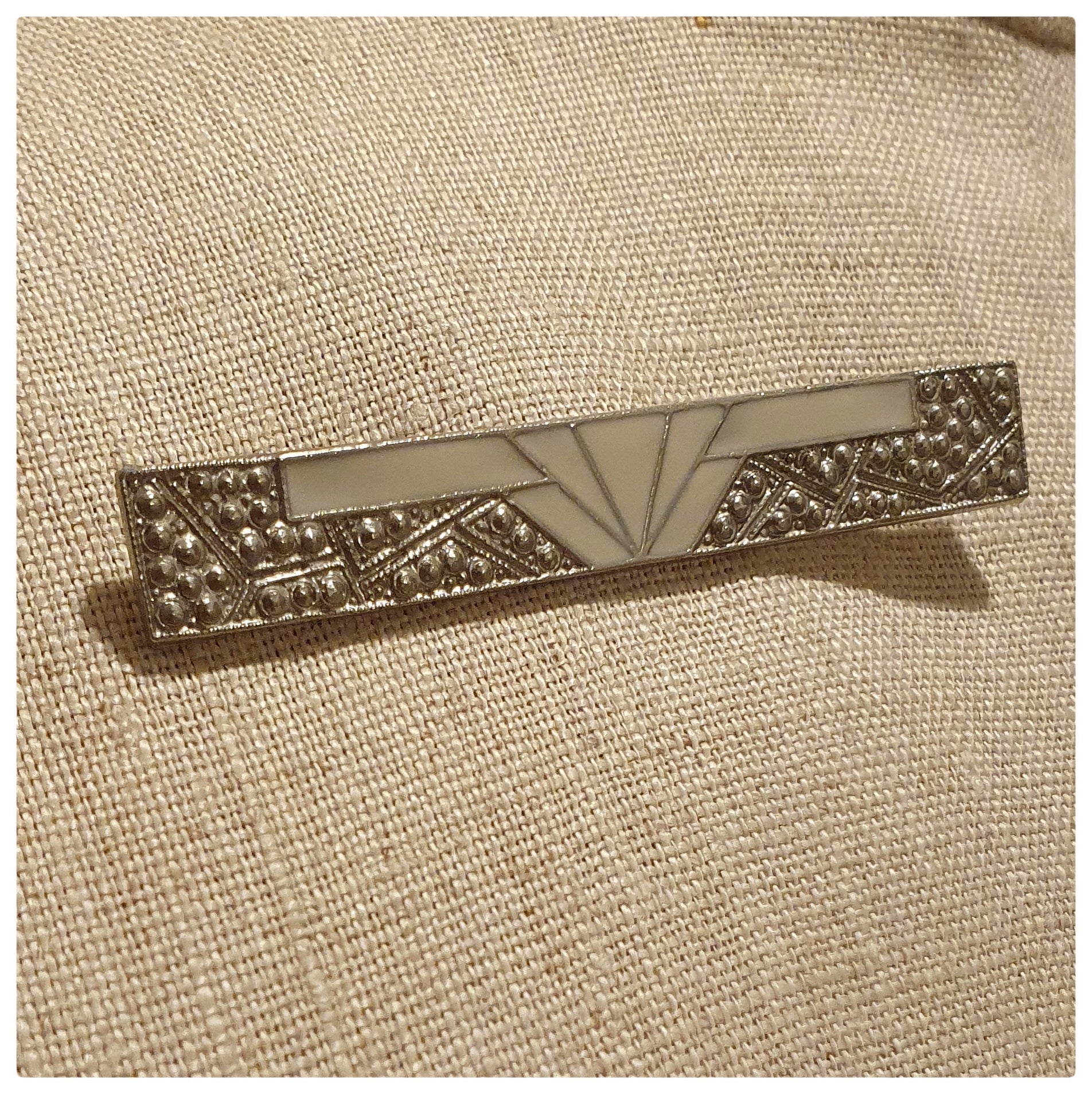 This brooch, inspired by Pierre Bex's signature style, features faux marcasite and enamel on a silver tone metal base. Equipped with a roll over clasp, it is a "new old stock" item, meaning it is an original vintage piece that has never been worn. Using original art deco molds and designs, Pierre Bex crafted reproductions of classic Art Deco jewellery in the 1960s and 1970s. Its length measures 2 3/4 inches.