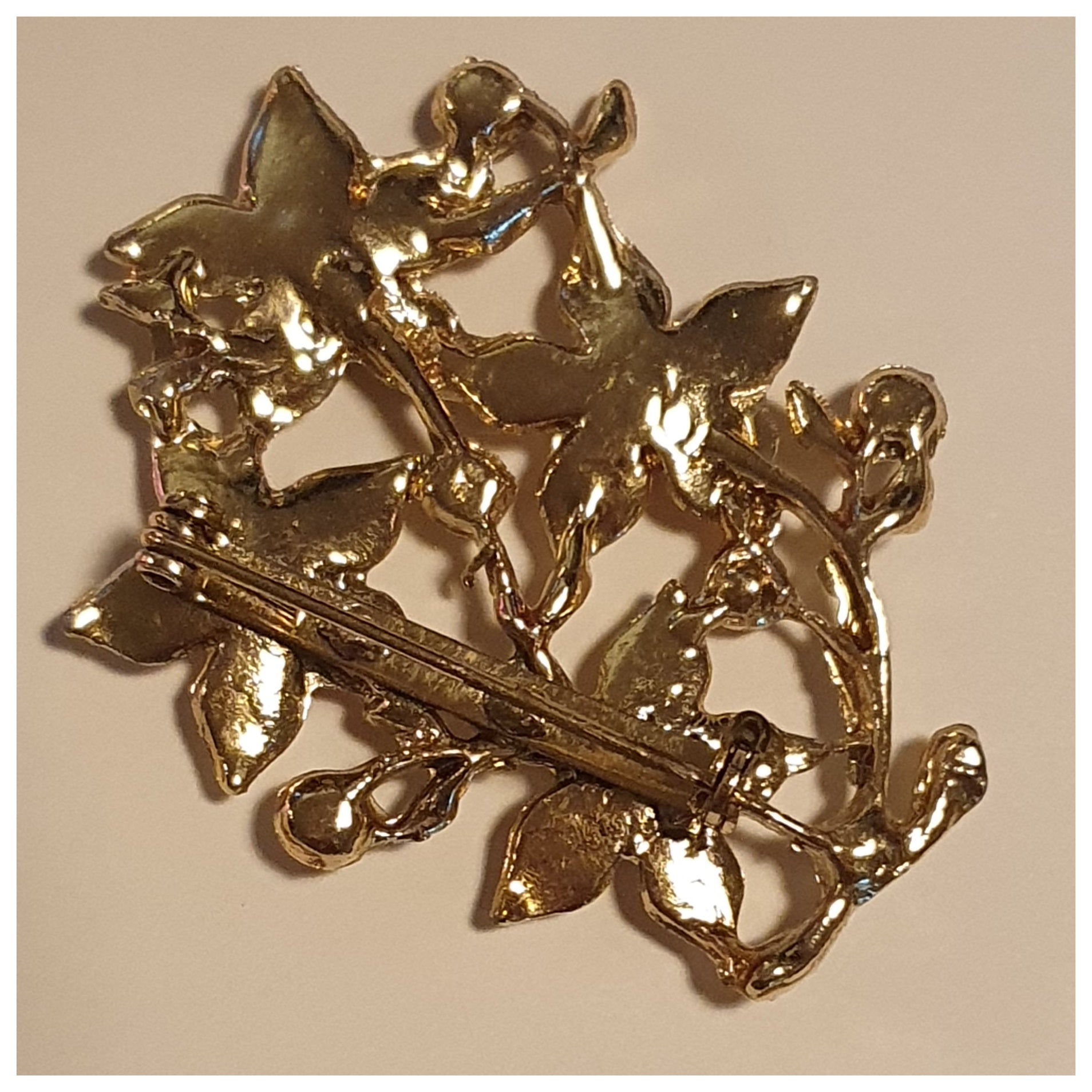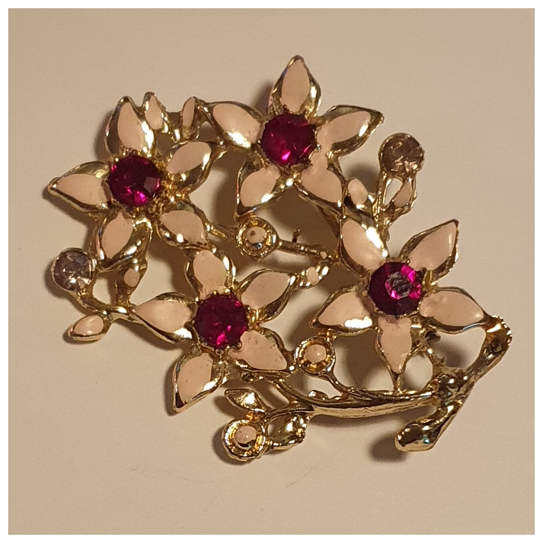 Elegant faux Ruby petals and delicate lilac gems adorn this exquisite brooch. Crafted with a goldtone metal base, the painted pink petals add a touch of refined artistry. Featuring a secure roll over clasp, this piece is in lovely condition with minimal age-related wear. Measuring 5.3 cm in length and 4.3 cm in width, it is a timeless addition to any collection.