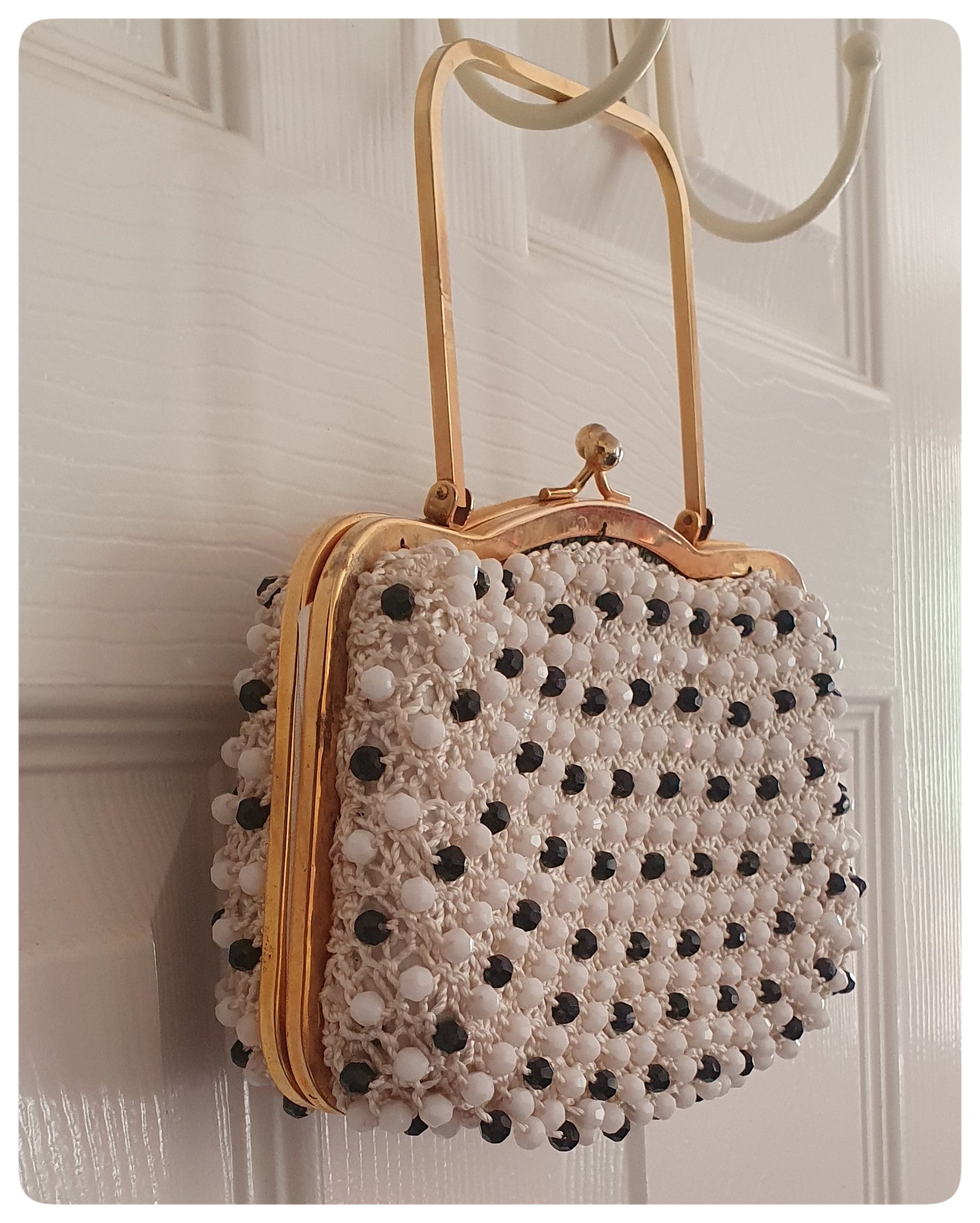 Introducing our stunning 1950s Empire made navy and white beaded bag- a structured frame bag adorned with intricate woven threads in a captivating navy and white pattern. The luxurious white satin lining boasts minimal marks, while the gold tone metal frame adds a touch of opulence with its kiss clasp and solid top handle on a delicate hinge. Inside, a single slip pocket provides convenience and functionality, and despite minor imperfections from previous storage, this bag still exudes timeless elegance and sophistication. Elevate your style with this Empire Made masterpiece, measuring 21.5cm x 12cm with a handle drop of 8cm.