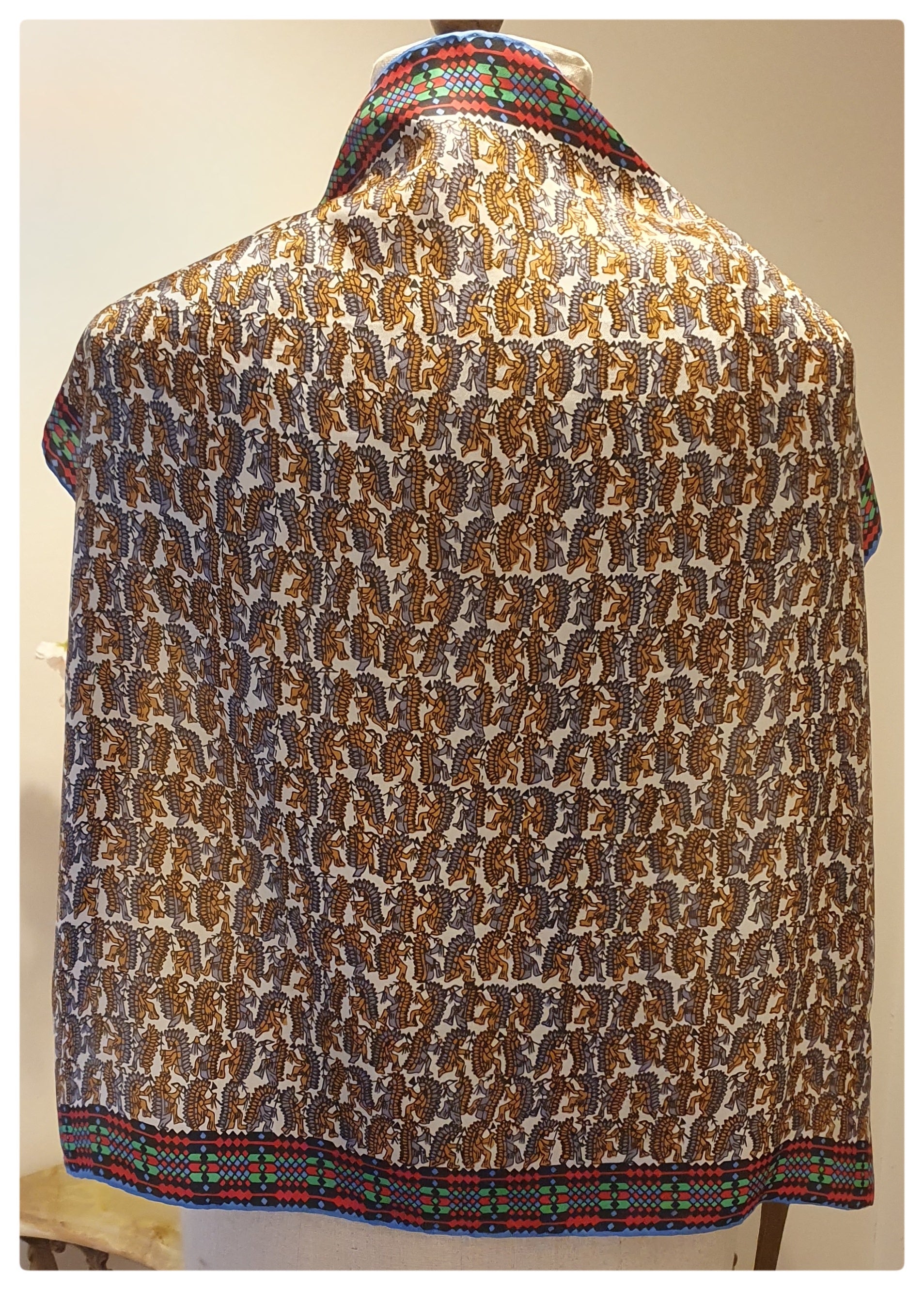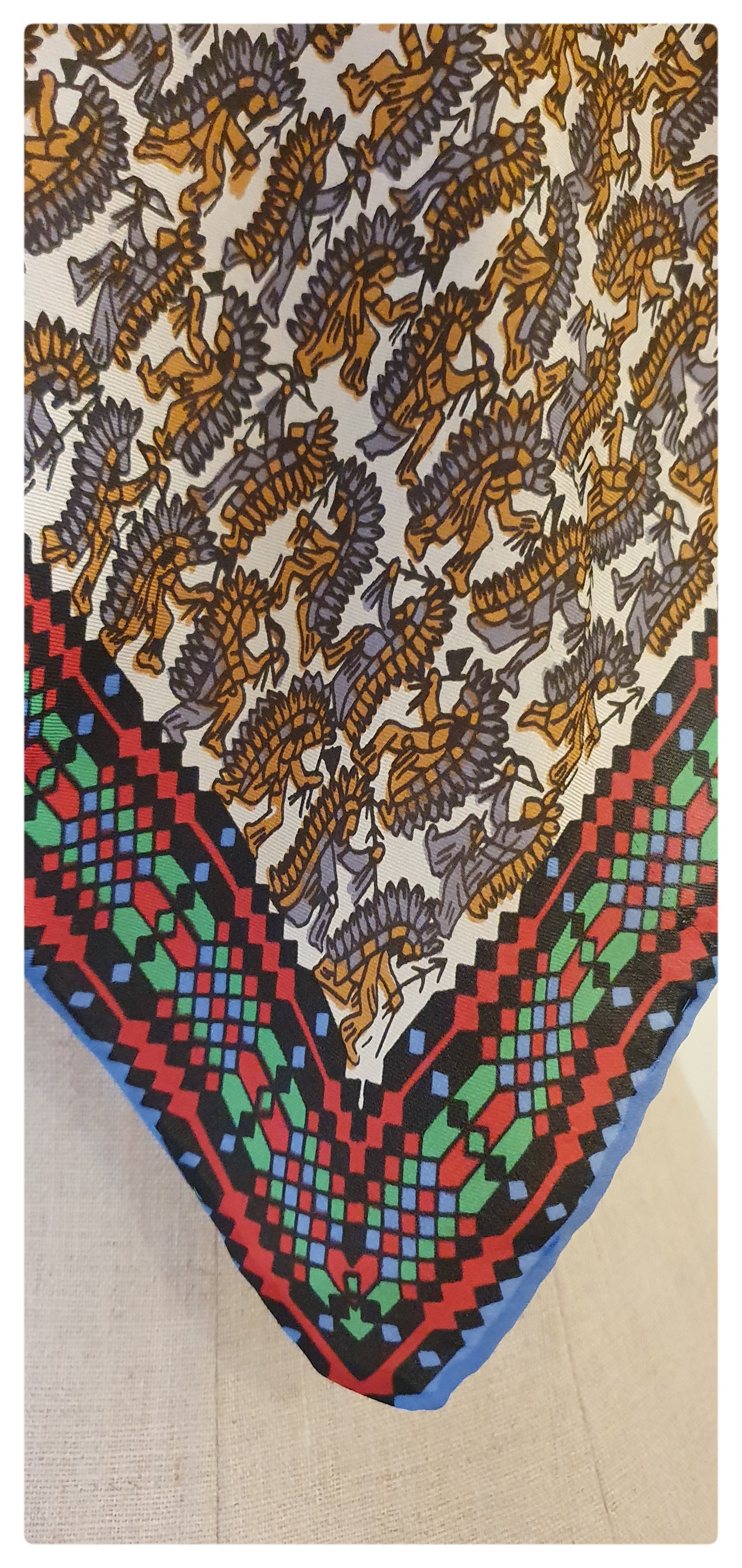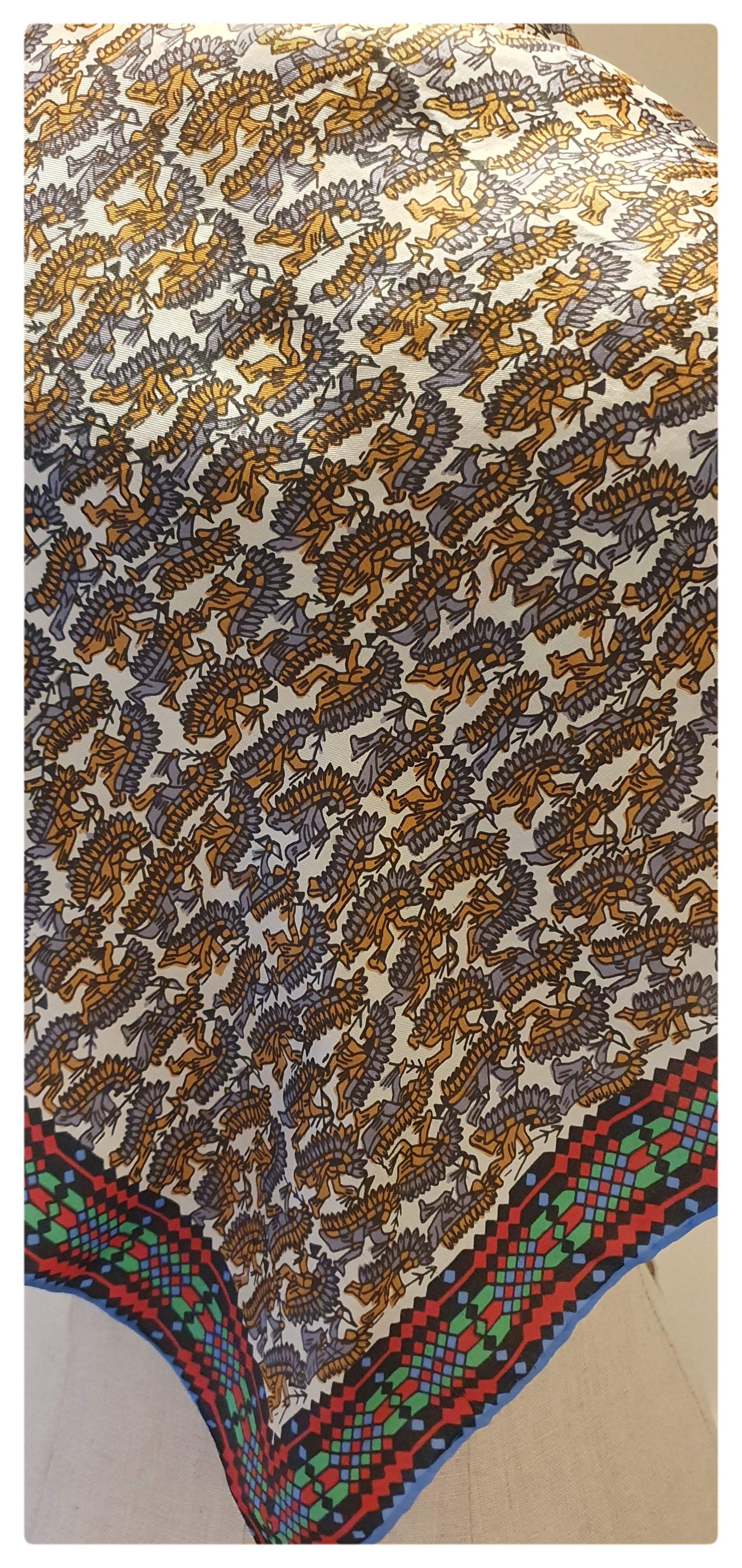 Quirky silk scarf with a design of red Indians. Edged with a geometric print in red, green, blue and black. Hand rolled edges. Lovely condition with no damage. Small label embroidered with "Glenty, 100% silk, hand rolled, made in Japan" Measures 23 x 23 inches
