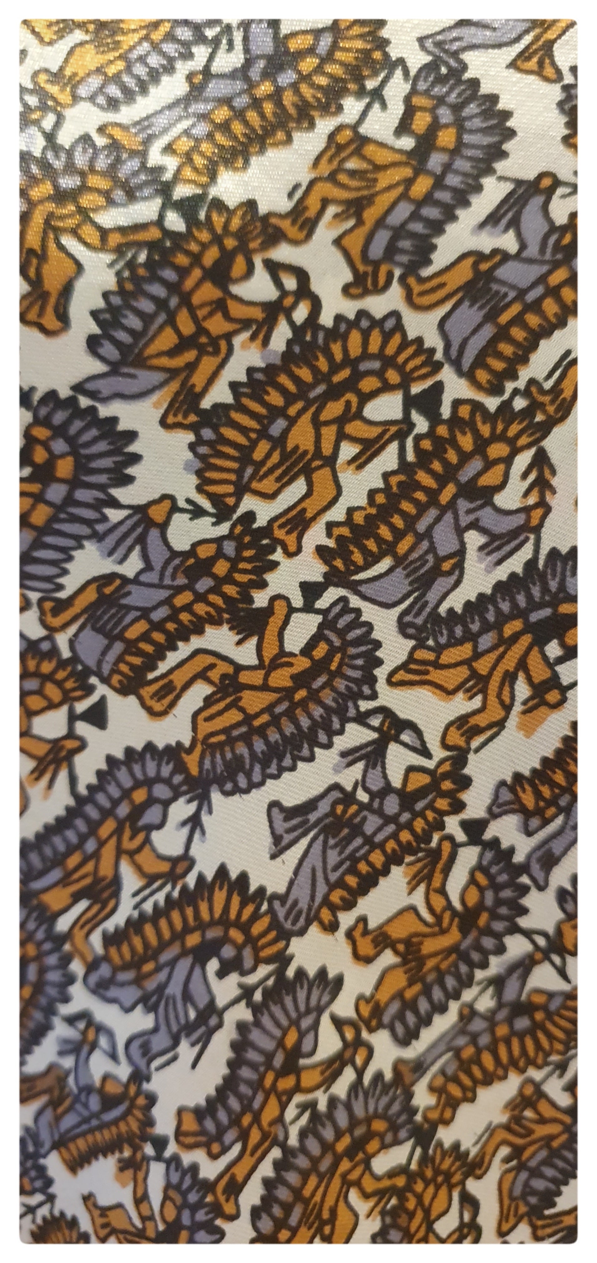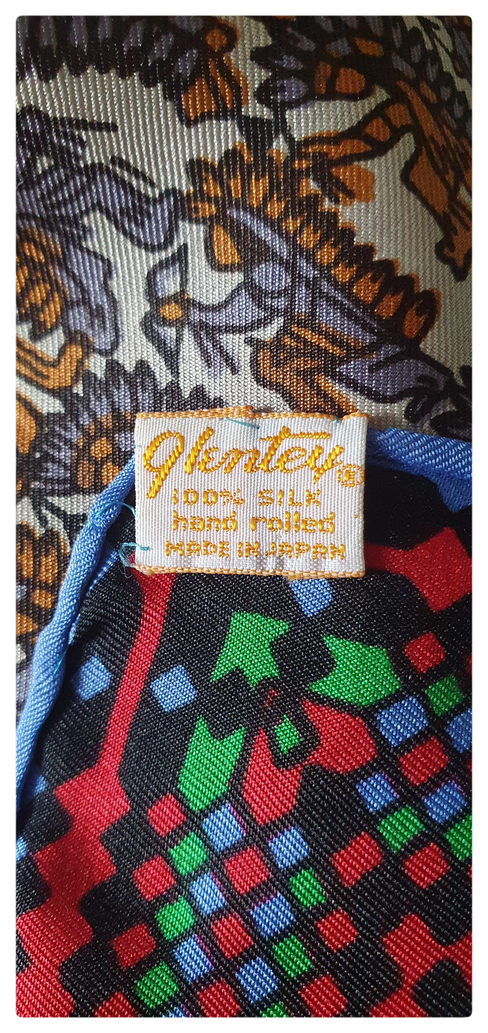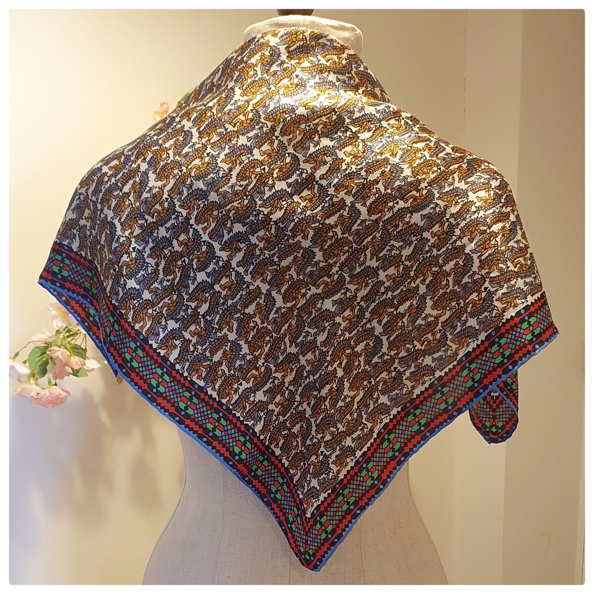 Quirky silk scarf with a design of red Indians. Edged with a geometric print in red, green, blue and black. Hand rolled edges. Lovely condition with no damage. Small label embroidered with "Glenty, 100% silk, hand rolled, made in Japan" Measures 23 x 23 inches