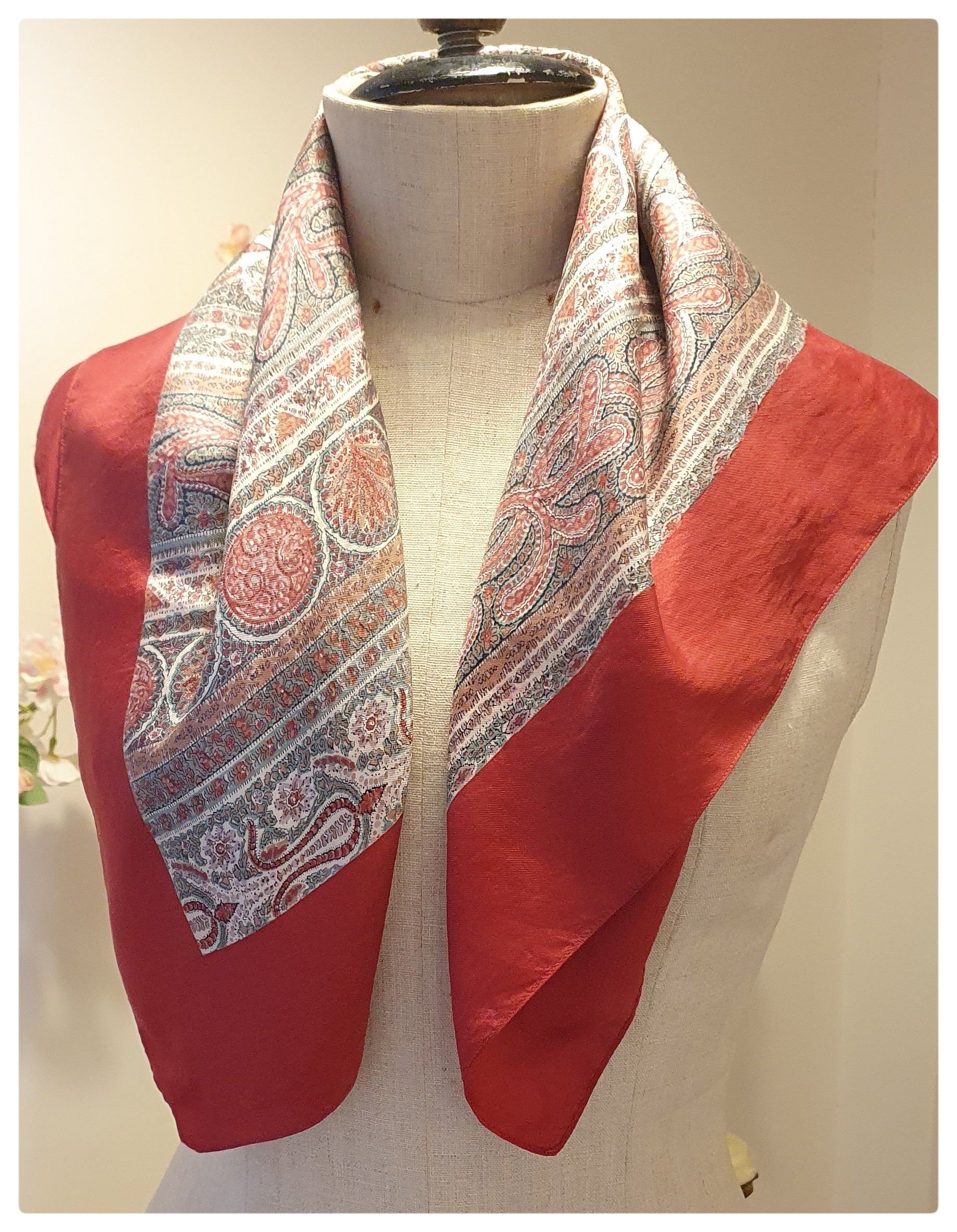 Presenting the exquisite Liberty silk scarf, a stunning vintage treasure in impeccable condition. Although a small hole can be found near the attached tag, it is hardly noticeable. Machine stitched edges. Measuring approximately 26 x 27 inches, this beautiful original piece is sure to delight.